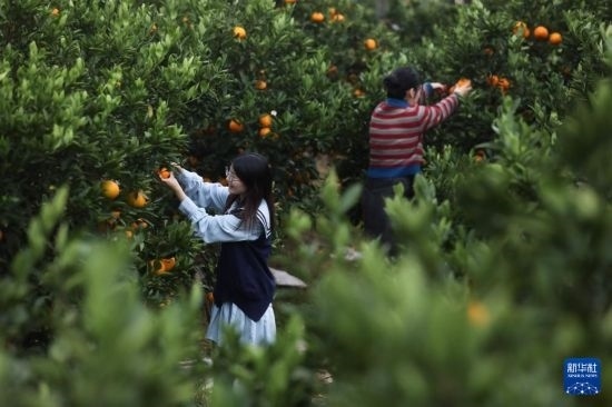 11月10日,在三都鎮(zhèn)柑橘種植基地,游客采摘柑橘。三都鎮(zhèn)柑橘種植面積達2.8萬畝,總產(chǎn)量4.2萬噸。