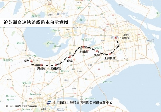 滬蘇湖高鐵是上海、蘇州、湖州基礎設施互聯(lián)互通的重大項目,也是長三角高鐵聯(lián)網、補網、強鏈的重點項目。滬蘇湖高鐵由上海虹橋站引出,途經蘇州市,終至湖州市湖州站,線路全長約163公里,設計時速350公里,設上海虹橋、上海松江、練塘、蘇州南、盛澤、湖州南潯、湖州東、湖州站等8座車站。