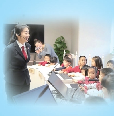 北京三中院組織開放日活動(dòng),法院干警(左一)為前來參觀的“小客人”介紹少年法庭。馬國(guó)強(qiáng)攝
