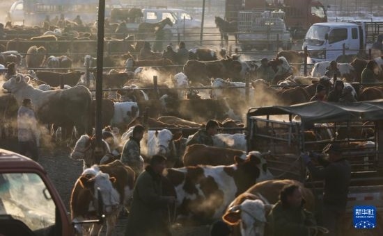 12月6日,人們?cè)诟拭C省定西市安定區(qū)李家堡鎮(zhèn)的牲畜交易市場(chǎng)交易。