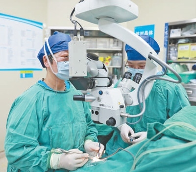湖南省湘潭市中心醫(yī)院眼科主任謝梅芬(左)在進行人工晶體植入手術(shù)。