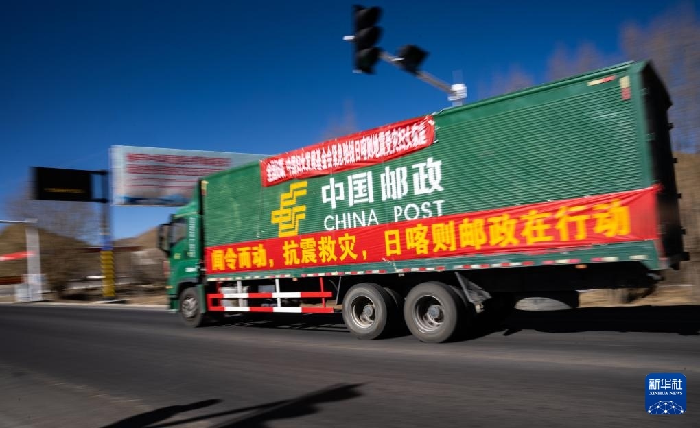 1月8日,在日喀則市境內(nèi)的318國道旁,中國郵政的抗震救災(zāi)物資運(yùn)輸車輛向震中方向駛?cè)ァ?/p>