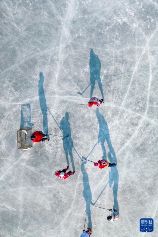 1月18日,人們?cè)诠枮I市丁香公園內(nèi)打冰球(無(wú)人機(jī)照片)。