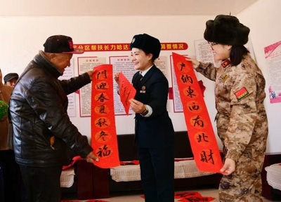 遼寧省朝陽市龍城區(qū)聯(lián)合鎮(zhèn)長立哈達(dá)村,朝陽軍分區(qū)官兵給幫扶老年人送春聯(lián)。