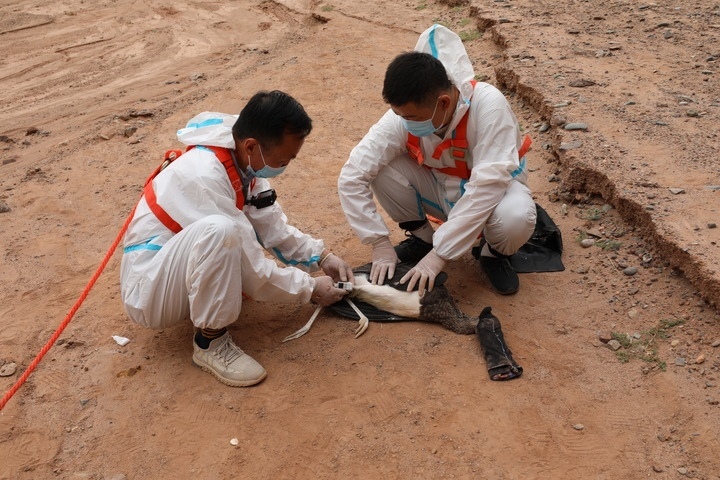 在甘肅張掖黑河濕地國家級自然保護(hù)區(qū),單國鋒(左)和同事為一只黑鸛戴上監(jiān)測設(shè)備(資料照片)。新華社發(fā)(甘肅張掖黑河濕地國家級自然保護(hù)區(qū)管理局供圖)