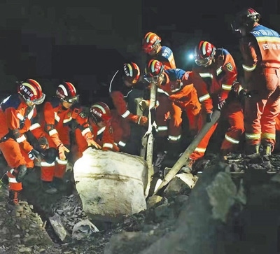 2月8日晚,在筠連縣山體滑坡現(xiàn)場(chǎng),消防救援人員進(jìn)行搜救。