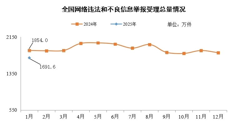 中央網(wǎng)信辦舉報(bào)中心2月17日公布的數(shù)據(jù)顯示,2025年1月,中央網(wǎng)信辦舉報(bào)中心指導(dǎo)全國(guó)各級(jí)網(wǎng)信舉報(bào)工作部門、主要網(wǎng)站平臺(tái)受理網(wǎng)民舉報(bào)色情、賭博、侵權(quán)、謠言等違法和不良信息1691.6萬(wàn)件,環(huán)比下降6.2%、同比下降8.8%。