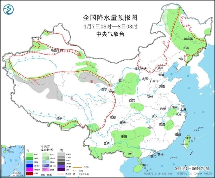 預(yù)計(jì)今明兩天,全國大部地區(qū)降水仍較弱,西南地區(qū)東部、江南、華南西部和北部、臺灣島等地部分地區(qū)有小到中雨,局地有大雨;今天(7日)新疆南疆西部、青海北部、內(nèi)蒙古東北部等地部分地區(qū)有小到中雪或雨夾雪。另外,8日夜間至9日,貴州東部、江南、華南北部等地部分地區(qū)有中到大雨,局地有暴雨,并伴有強(qiáng)對流天氣。