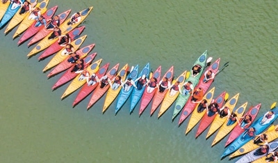 4月25日,重慶市南川區(qū)黎香湖鎮(zhèn)黎香湖皮劃艇基地,游客們?cè)诤矬w驗(yàn)水上運(yùn)動(dòng)樂趣。據(jù)介紹,“五一”假期期間該皮劃艇基地已預(yù)約滿員。