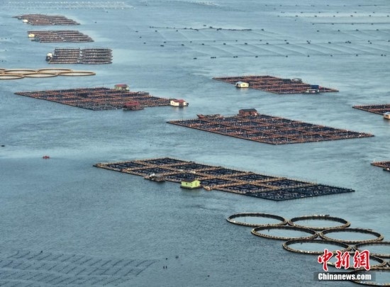 5月2日,福建福州福清市沙埔鎮(zhèn)養(yǎng)殖海域,養(yǎng)殖網(wǎng)箱漂浮在海面上,海上風(fēng)車依次排開,蔚為壯觀。(無人機照片)