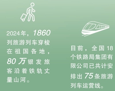 今年2月,商務部、文化和旅游部、中國國家鐵路集團有限公司等9單位聯合發(fā)布《關于增開銀發(fā)旅游列車促進服務消費發(fā)展的行動計劃》,指出要擴容旅游列車線路和產品,豐富銀發(fā)旅游列車產品供給,建立品質型、舒適型、普惠型產品體系。目前,全國18個鐵路局集團有限公司已共計安排出75條旅游列車運營線。一趟趟銀發(fā)列車如春日繁花次第綻放,為老年人鋪就通往詩與遠方的旅途,更以流動的風景線激活沿線文旅消費,為推動經濟高質量發(fā)展注入“銀發(fā)”新動能。