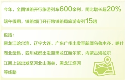 國鐵集團數(shù)據(jù)顯示:今年全國鐵路已開行旅游列車600余列,同比增長超20%。端午假期,鐵路部門開行跨鐵路局旅游專列15趟,包括從黑龍江哈爾濱、遼寧大連、廣東廣州出發(fā)至新疆烏魯木齊、喀什,湖北武昌、四川成都出發(fā)至黑龍江哈爾濱、內(nèi)蒙古海拉爾,江西上饒出發(fā)至河北山海關、黑龍江塔河等線路。