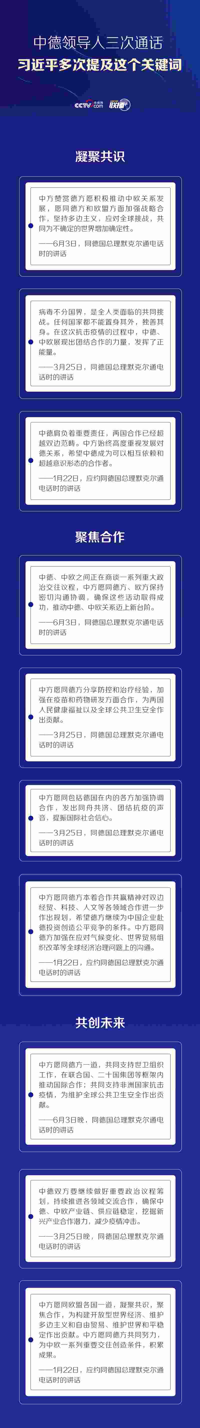 聯(lián)播+6月3日晚,習(xí)近平主席同德國總理默克爾通電話。這是自新冠肺炎疫情暴發(fā)以來,雙方第三次通話。習(xí)近平強調(diào),近日中德“快捷通道”正式啟動,這有利于幫助兩國有需求的企業(yè)加快復(fù)工復(fù)產(chǎn),維護國際產(chǎn)業(yè)鏈、供應(yīng)鏈穩(wěn)定。