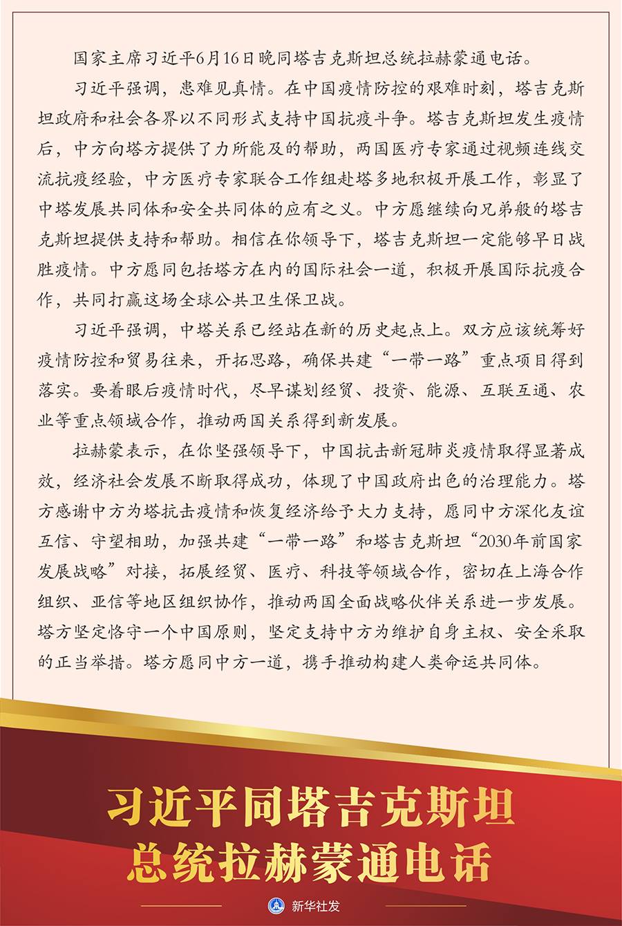 習(xí)近平強(qiáng)調(diào),患難見(jiàn)真情。在中國(guó)疫情防控的艱難時(shí)刻,塔吉克斯坦政府和社會(huì)各界以不同形式支持中國(guó)抗疫斗爭(zhēng)。塔吉克斯坦發(fā)生疫情后,中方向塔方提供了力所能及的幫助,兩國(guó)醫(yī)療專家通過(guò)視頻連線交流抗疫經(jīng)驗(yàn),中方醫(yī)療專家聯(lián)合工作組赴塔多地積極開展工作,彰顯了中塔發(fā)展共同體和安全共同體的應(yīng)有之義。中方愿繼續(xù)向兄弟般的塔吉克斯坦提供支持和幫助。相信在你領(lǐng)導(dǎo)下,塔吉克斯坦一定能夠早日戰(zhàn)勝疫情。中方愿同包括塔方在內(nèi)的國(guó)際社會(huì)一道,積極開展國(guó)際抗疫合作,共同打贏這場(chǎng)全球公共衛(wèi)生保衛(wèi)戰(zhàn)。