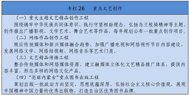 堅(jiān)持以人民為中心的創(chuàng)作導(dǎo)向,創(chuàng)作生產(chǎn)出人民喜聞樂見的優(yōu)秀作品。繁榮發(fā)展新聞出版、廣播影視、文學(xué)藝術(shù),實(shí)施文藝作品質(zhì)量提升工程,加強(qiáng)優(yōu)秀劇本孵化和生活采風(fēng)。推動(dòng)重大主題文藝精品創(chuàng)作,加強(qiáng)現(xiàn)實(shí)題材創(chuàng)作生產(chǎn)。改進(jìn)重點(diǎn)作品創(chuàng)作引導(dǎo)機(jī)制,建立重點(diǎn)文化藝術(shù)項(xiàng)目滾動(dòng)扶持機(jī)制。設(shè)立內(nèi)蒙古文化藝術(shù)發(fā)展專項(xiàng)資金。加強(qiáng)文化文藝場館建設(shè)。制定文藝人才發(fā)展規(guī)劃,開展內(nèi)蒙古電影新導(dǎo)演計(jì)劃。實(shí)施文化潤心工程,以文藝創(chuàng)作鑄牢中華民族共同體意識(shí)。提升廣播電視和網(wǎng)絡(luò)視聽產(chǎn)品質(zhì)量,豐富網(wǎng)絡(luò)文藝內(nèi)容。搭建文藝精品遴選、展示、推出平臺(tái),建設(shè)內(nèi)蒙古音樂廳,支持因地制宜建設(shè)綜合劇場、音樂廳和美術(shù)館,舉辦內(nèi)蒙古藝術(shù)節(jié)、內(nèi)蒙古音樂節(jié)等活動(dòng),大力實(shí)施文藝惠民演出和地方戲傳承創(chuàng)新工程,定期舉辦全區(qū)地方戲優(yōu)秀劇目展演以及音樂、舞蹈、小戲小品專業(yè)賽事,打造獨(dú)具特色的文化藝術(shù)品牌。