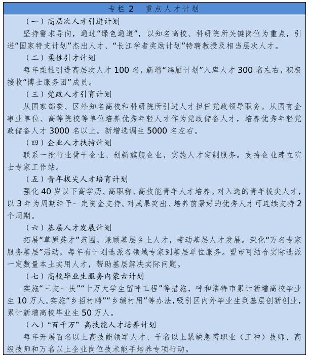 深入落實(shí)人才強(qiáng)國戰(zhàn)略,聚焦國家和自治區(qū)重大戰(zhàn)略、重大工程項(xiàng)目和重點(diǎn)產(chǎn)業(yè)領(lǐng)域,銜接國家重大人才工程,健全人才培養(yǎng)、引進(jìn)、使用、評(píng)價(jià)、流動(dòng)和激勵(lì)機(jī)制,強(qiáng)化用人單位主體責(zé)任,激發(fā)人才創(chuàng)新活力。到2025年,全區(qū)人才資源總量達(dá)到350萬人。