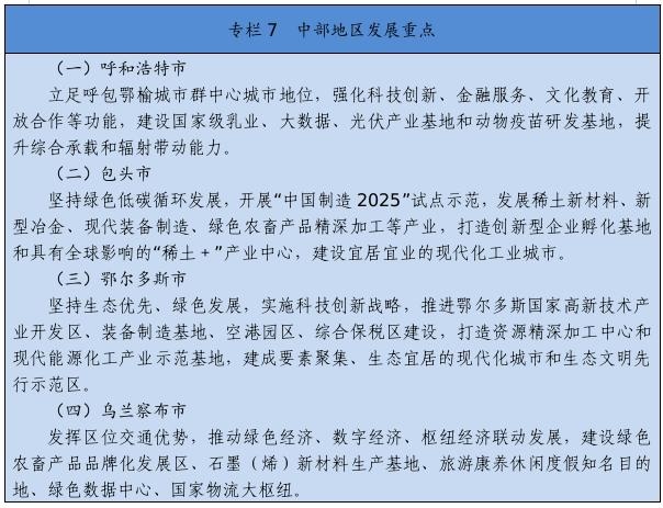 高標(biāo)準(zhǔn)打造稀土新材料、乳業(yè)國家技術(shù)創(chuàng)新中心,在優(yōu)勢特色產(chǎn)業(yè)領(lǐng)域培育一批國家重點(diǎn)實(shí)驗(yàn)室,布局建設(shè)自治區(qū)重點(diǎn)實(shí)驗(yàn)室、工程研究中心、產(chǎn)業(yè)創(chuàng)新中心、技術(shù)創(chuàng)新中心,構(gòu)建形成創(chuàng)新平臺(tái)體系。高質(zhì)量建設(shè)呼包鄂國家自主創(chuàng)新示范區(qū)、鄂爾多斯國家可持續(xù)發(fā)展議程創(chuàng)新示范區(qū)和巴彥淖爾國家農(nóng)業(yè)高新技術(shù)產(chǎn)業(yè)示范區(qū)。重點(diǎn)實(shí)施國家級(jí)高新區(qū)“提質(zhì)進(jìn)位”行動(dòng),爭取包頭稀土、呼和浩特金山、鄂爾多斯三個(gè)國家級(jí)高新技術(shù)產(chǎn)業(yè)開發(fā)區(qū)在全國高新技術(shù)開發(fā)區(qū)排名晉升5個(gè)位次。開展自治區(qū)級(jí)高新區(qū)“促優(yōu)培育”行動(dòng),推動(dòng)赤峰、阿拉善、通遼高新區(qū)升級(jí)國家級(jí)高新區(qū),打造若干創(chuàng)新資源集聚高地。高質(zhì)量推進(jìn)“科創(chuàng)中國”試點(diǎn)城市建設(shè),大力實(shí)施科技創(chuàng)新賦能行動(dòng),促進(jìn)科技經(jīng)濟(jì)深度融合。