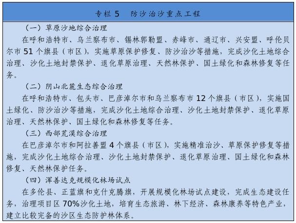 繼續(xù)實(shí)施京津風(fēng)沙源治理等重點(diǎn)工程,推廣庫布其沙漠治理方式和沙產(chǎn)業(yè)模式,推動(dòng)渾善達(dá)克、烏珠穆沁、呼倫貝爾沙地治理。推進(jìn)規(guī)模化林場建設(shè),采取人工造林、封沙育林、飛播造林等方式恢復(fù)植被。建設(shè)荒漠綠洲防護(hù)林、防風(fēng)固沙林、沙漠鎖邊林、農(nóng)田草牧場防護(hù)林以及水土保持林。以干旱半干旱草原為重點(diǎn),加強(qiáng)草場改良和人工種草,實(shí)行圍封禁牧、劃區(qū)輪牧、季節(jié)性休牧、舍飼圈養(yǎng)等措施,保護(hù)和恢復(fù)草原植被。以內(nèi)蒙古高原等為重點(diǎn),推進(jìn)防護(hù)林體系建設(shè)及退化林修復(fù)、退化草原修復(fù)、京津風(fēng)沙源治理。新增水土流失綜合治理3.33萬平方公里。