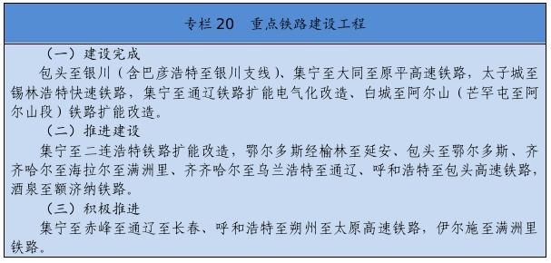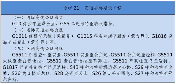 基礎(chǔ)設(shè)施保障更加有力。交通運(yùn)輸、能源外送通道和引調(diào)水骨干工程接續(xù)落地。綜合交通運(yùn)輸體系基本形成,接入全國高鐵網(wǎng),呼和浩特至張家口高速鐵路,通遼、赤峰至京沈高速鐵路連接線,浩勒報(bào)吉至吉安鐵路順利建成,建成高速鐵路404公里。全區(qū)103個(gè)旗縣(市區(qū))全部通高等級(jí)公路,京新高速臨河至哈密、丹錫高速錫林浩特至巴林右旗等高速公路通車運(yùn)營,所有鄉(xiāng)鎮(zhèn)(蘇木)和具備條件的建制村通硬化路,建成“四好農(nóng)村路”6.6萬公里,綜合交通網(wǎng)總里程達(dá)到22.5萬公里。呼和浩特新機(jī)場開工建設(shè),呼倫貝爾、包頭、通遼等機(jī)場完成改擴(kuò)建。新建通用機(jī)場15個(gè),民用機(jī)場達(dá)到40個(gè)。黃河內(nèi)蒙古段二期防洪、引綽濟(jì)遼、東臺(tái)子水庫等重大水利工程建設(shè)順利推進(jìn)。全區(qū)5G基站突破1萬個(gè)。建成5條特高壓外送電通道。克什克騰至北京煤制氣管道投入運(yùn)營。呼和浩特地鐵1、2號(hào)線一期工程建成運(yùn)營。