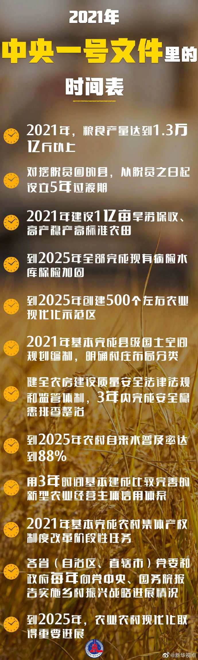 2021年糧食產(chǎn)量達(dá)到1.3萬(wàn)億斤以上、2021年建設(shè)1億畝高標(biāo)準(zhǔn)農(nóng)田、到2025年農(nóng)村自來(lái)水普及率達(dá)到88%……今年中央一號(hào)文件仍聚焦“三農(nóng)”,對(duì)多方面工作作出詳細(xì)部署,明確了時(shí)間表。一起了解下↓
