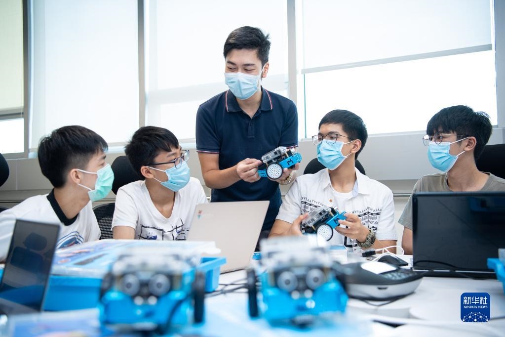 2020年7月14日,創(chuàng)業(yè)者吳以航在澳門青年創(chuàng)業(yè)孵化中心為學(xué)生上培訓(xùn)課?!?0后”吳以航是澳門青年創(chuàng)業(yè)孵化中心會員,2019年,他進駐廣州市天河區(qū)港澳青年之家,成立藍點教育技術(shù)(廣州)有限公司。新華社記者張金加攝
