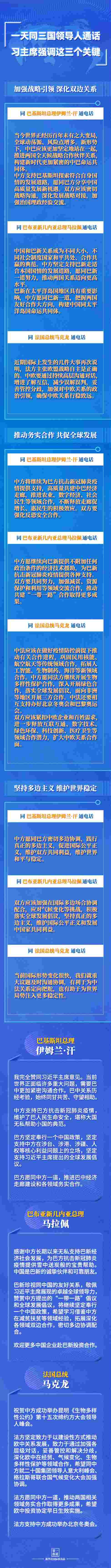 中國和巴基斯坦是“全天候戰(zhàn)略合作伙伴關(guān)系”;中國和巴新是“不同大小、不同社會(huì)制度國家和平共處、合作共贏的典范”;中國和法國同為聯(lián)合國安理會(huì)常任理事國……3次通話內(nèi)容豐富,“第一報(bào)道”為您梳理——
