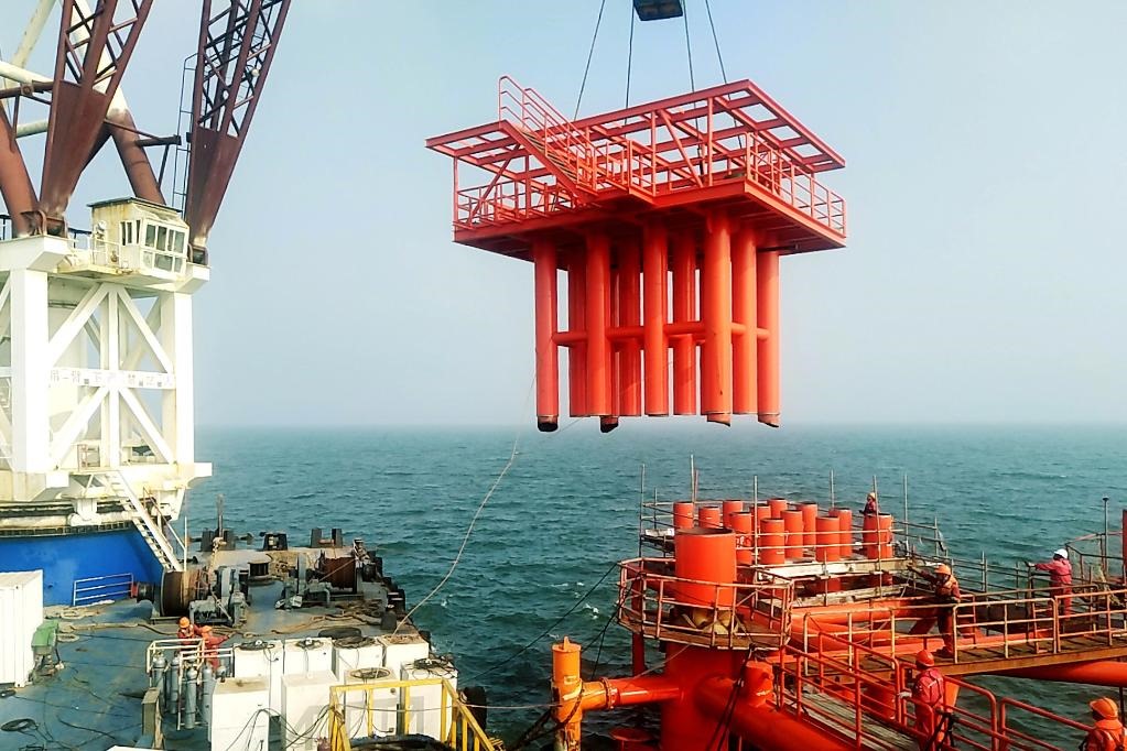 2021年8月21日,中國(guó)石化勝利油田海上新建產(chǎn)能項(xiàng)目埕北208井口平臺(tái)吊裝安全就位。(勝利油田供圖)