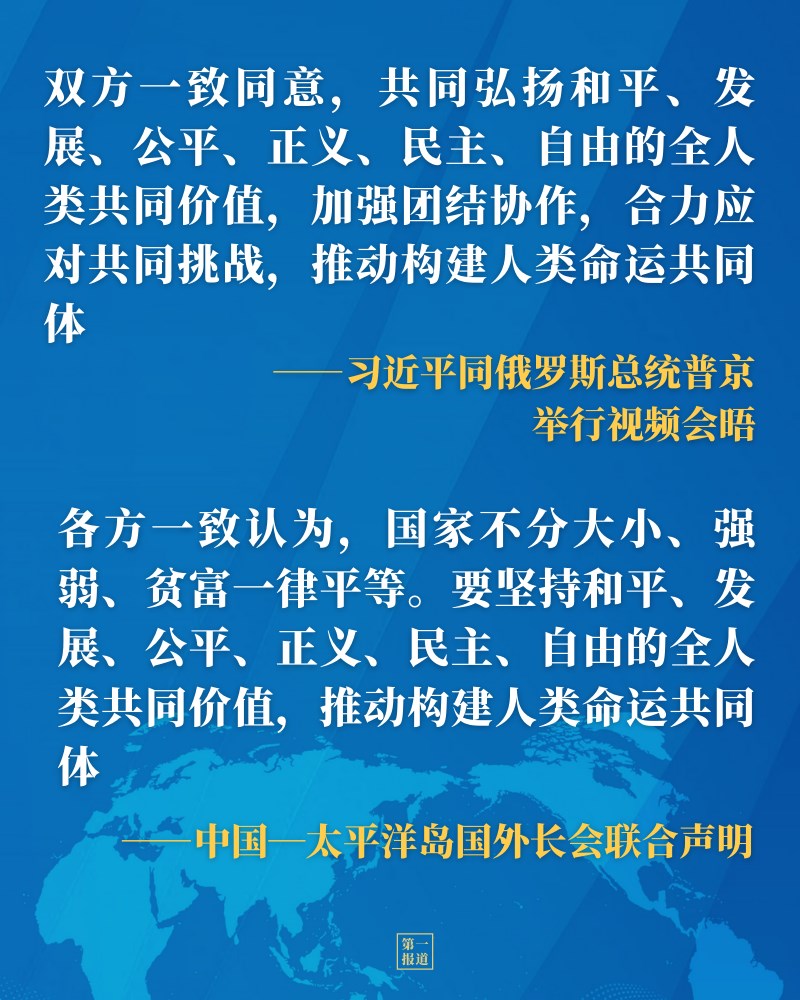從同普京總統(tǒng)視頻會晤、同菲律賓總統(tǒng)杜特爾特通電話,到第七十屆聯(lián)合國大會一般性辯論、世界經(jīng)濟論壇“達沃斯議程”對話會、中國共產(chǎn)黨與世界政黨領(lǐng)導(dǎo)人峰會等多邊場合,習(xí)近平主席多次闡述全人類共同價值的深刻內(nèi)涵,凝聚中外共識。