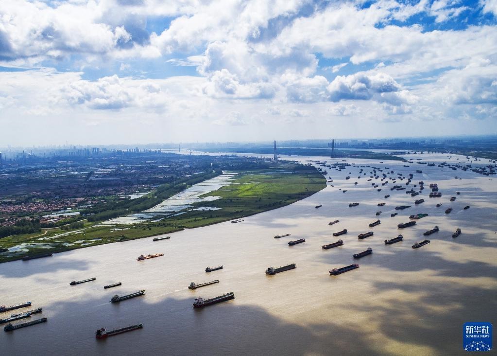 船舶在湖北省武漢市陽邏港區(qū)水域行駛(2018年8月13日攝,無人機照片)。新華社記者 肖藝九 攝