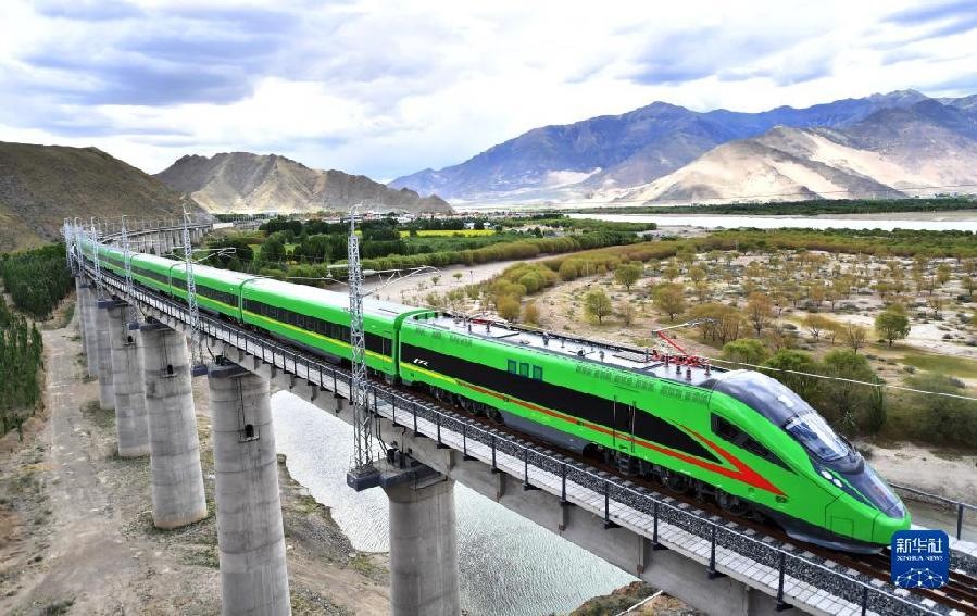這是試運行的復(fù)興號列車行駛在西藏山南市境內(nèi)(6月16日攝)。6月25日,全長435公里、設(shè)計時速160公里的拉林鐵路建成通車,西藏首條電氣化鐵路建成,同時復(fù)興號實現(xiàn)對31個省區(qū)市全覆蓋。新華社記者