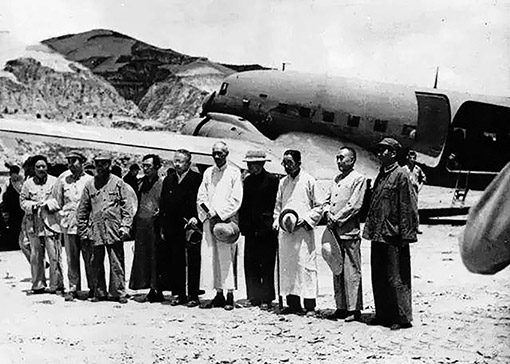 1945年7月,國(guó)民參政會(huì)參政員黃炎培等六人飛抵延安,同中國(guó)共產(chǎn)黨商談兩黨團(tuán)結(jié)、共建國(guó)內(nèi)和平問(wèn)題,毛澤東等親臨機(jī)場(chǎng)歡迎。圖:新華社