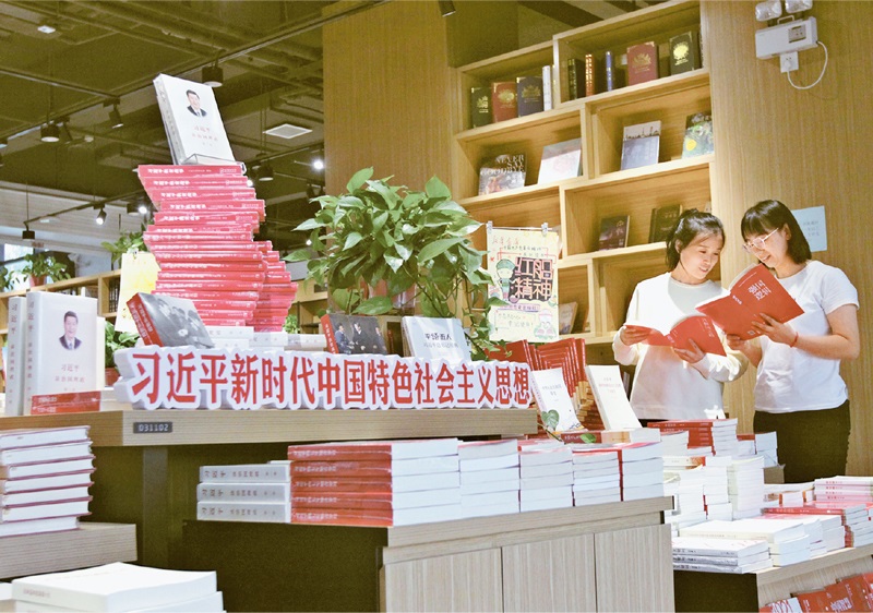 黨確立習(xí)近平同志黨中央的核心、全黨的核心地位,確立習(xí)近平新時代中國特色社會主義思想的指導(dǎo)地位,反映了全黨全軍全國各族人民共同心愿,對新時代黨和國家事業(yè)發(fā)展、對推進(jìn)中華民族偉大復(fù)興歷史進(jìn)程具有決定性意義。圖為2021年10月4日,河南省焦作市博愛縣新華書店里,讀者在閱讀習(xí)近平新時代中國特色社會主義思想相關(guān)書籍。 中新社發(fā) 程全/攝