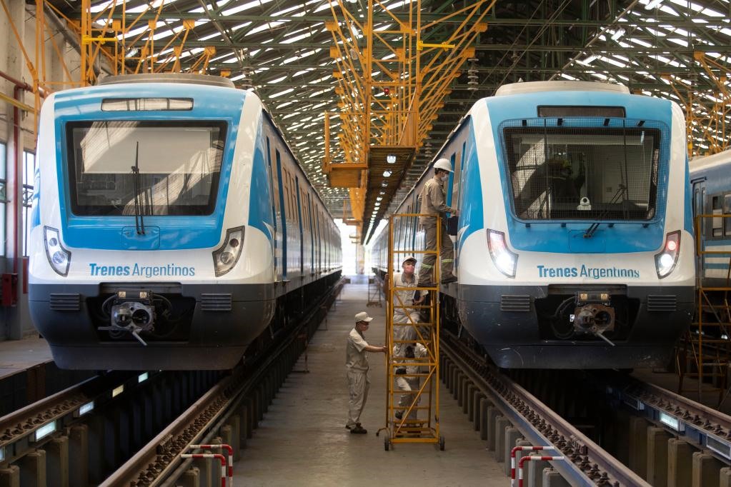 2020年11月16日,在布宜諾斯艾利斯省拉瓦約,中國和阿根廷技術(shù)人員對阿根廷城際鐵路列車進(jìn)行日常檢查。