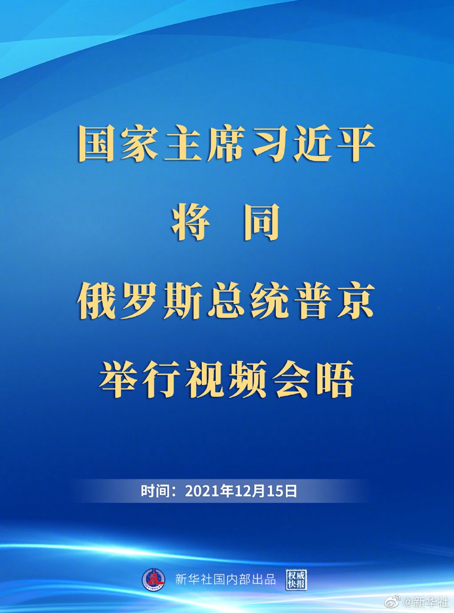 外交部發(fā)言人華春瑩12月13日宣布:國家主席習(xí)近平將于12月15日在北京同俄羅斯聯(lián)邦總統(tǒng)普京舉行視頻會(huì)晤。