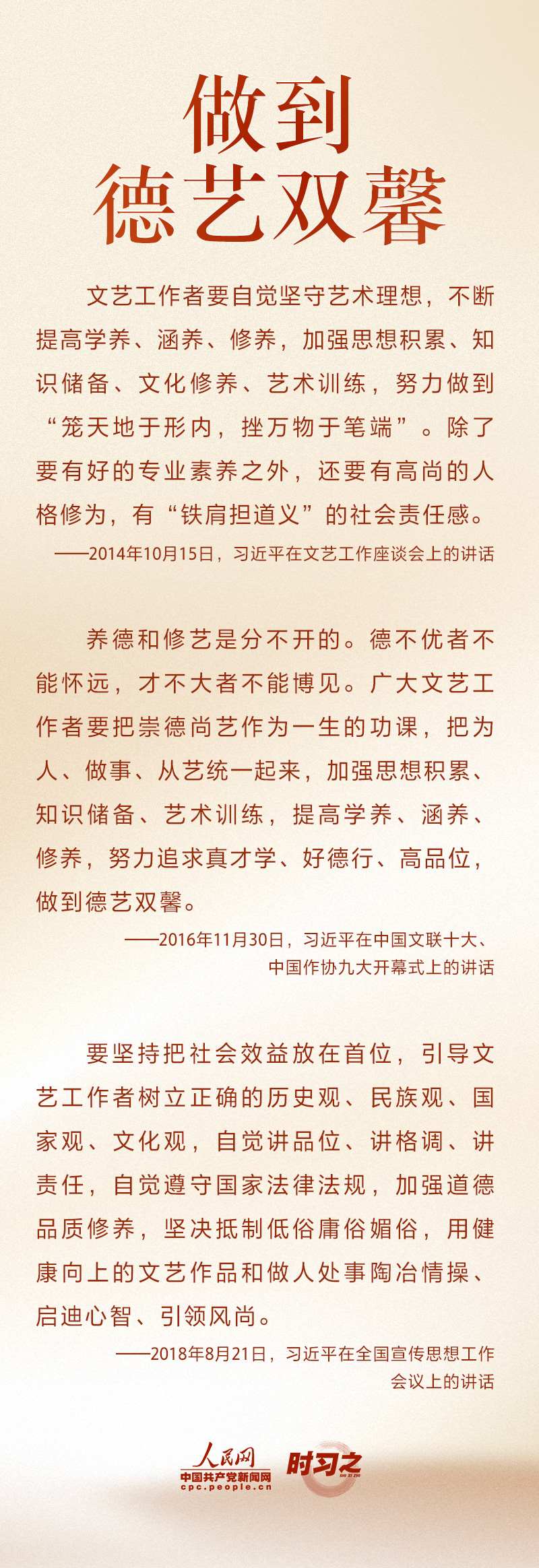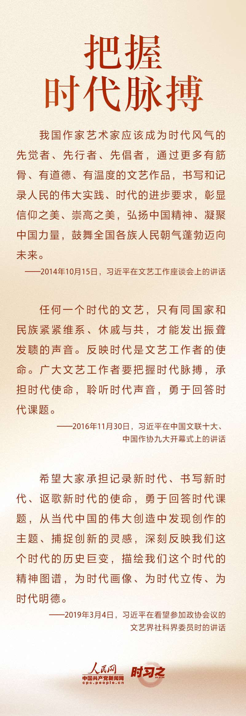 文運(yùn)同國(guó)運(yùn)相牽,文脈同國(guó)脈相連。新時(shí)代文藝工作者承擔(dān)著記錄新時(shí)代、書寫新時(shí)代、謳歌新時(shí)代的重大使命?!拔乃囀氰T造靈魂的工程,文藝工作者是靈魂的工程師。”黨的十八大以來,習(xí)近平不斷激勵(lì)文藝工作者不辜負(fù)時(shí)代召喚、不辜負(fù)人民期待,以德服人、以文化人。