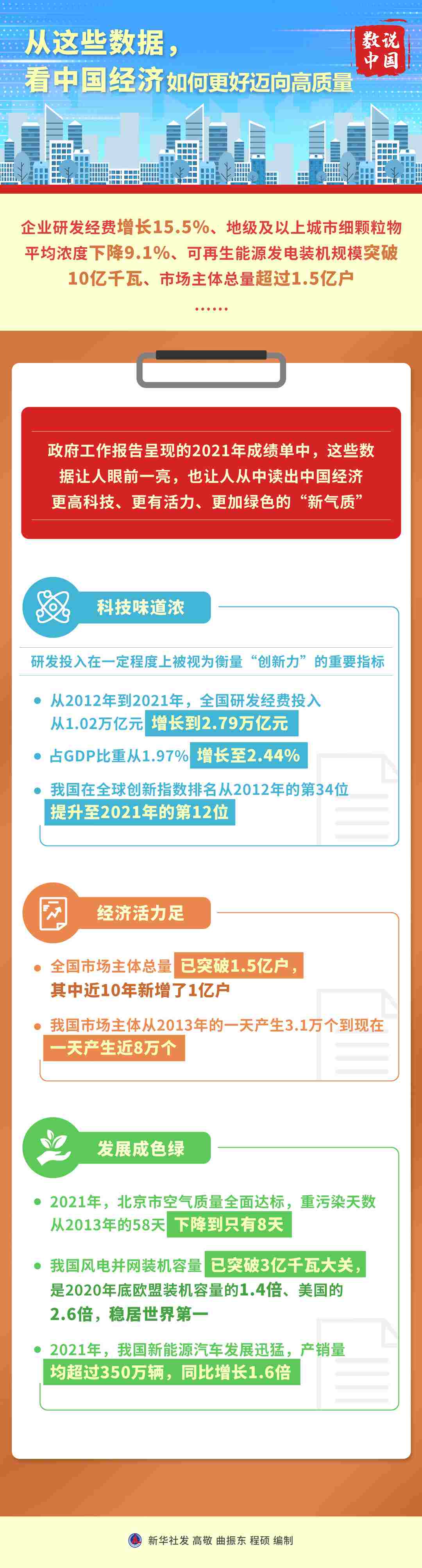 企業(yè)研發(fā)經(jīng)費增長15.5%、市場主體總量超過1.5億戶、可再生能源發(fā)電裝機(jī)規(guī)模突破10億千瓦……政府工作報告呈現(xiàn)的2021年成績單中,這些數(shù)據(jù)讓人眼前一亮。同時,報告的一系列新部署,也讓人從中讀出中國經(jīng)濟(jì)更重創(chuàng)新、更加綠色,更堅定邁向高質(zhì)量發(fā)展。
