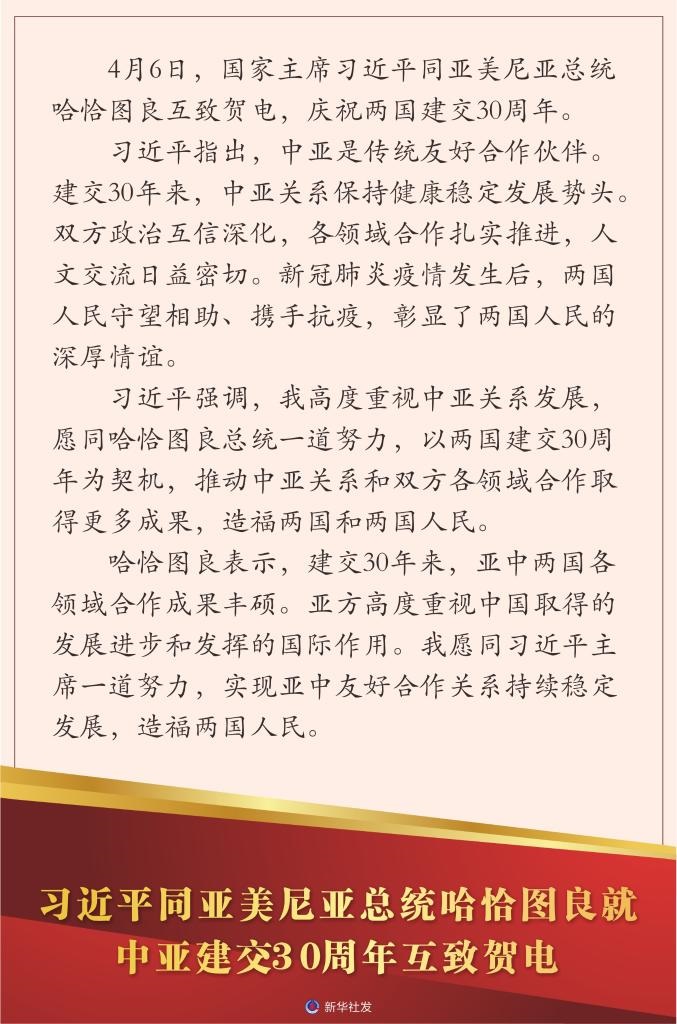 習(xí)近平強(qiáng)調(diào),我高度重視中亞關(guān)系發(fā)展,愿同哈恰圖良總統(tǒng)一道努力,以兩國建交30周年為契機(jī),推動(dòng)中亞關(guān)系和雙方各領(lǐng)域合作取得更多成果,造福兩國和兩國人民。