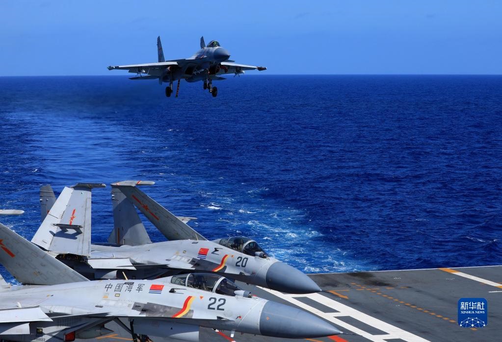 海軍遼寧艦編隊遠(yuǎn)海實戰(zhàn)化訓(xùn)練期間,殲-15艦載戰(zhàn)斗機(jī)準(zhǔn)備著艦(資料照片)。新華社發(fā)(胡善敏攝)
