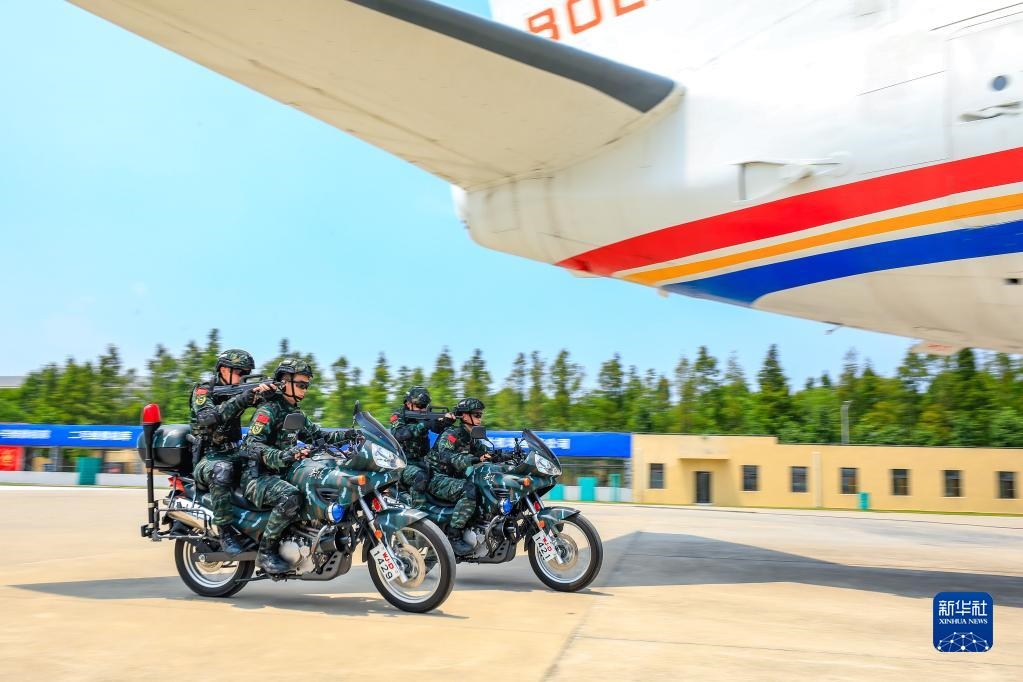 武警上??傟牂C(jī)動第一支隊特戰(zhàn)某中隊組織交通工具反劫持綜合演練,特戰(zhàn)隊員乘坐摩托車接近“被劫持飛機(jī)”(2022年8月1日攝)。新華社發(fā)(李巖攝)