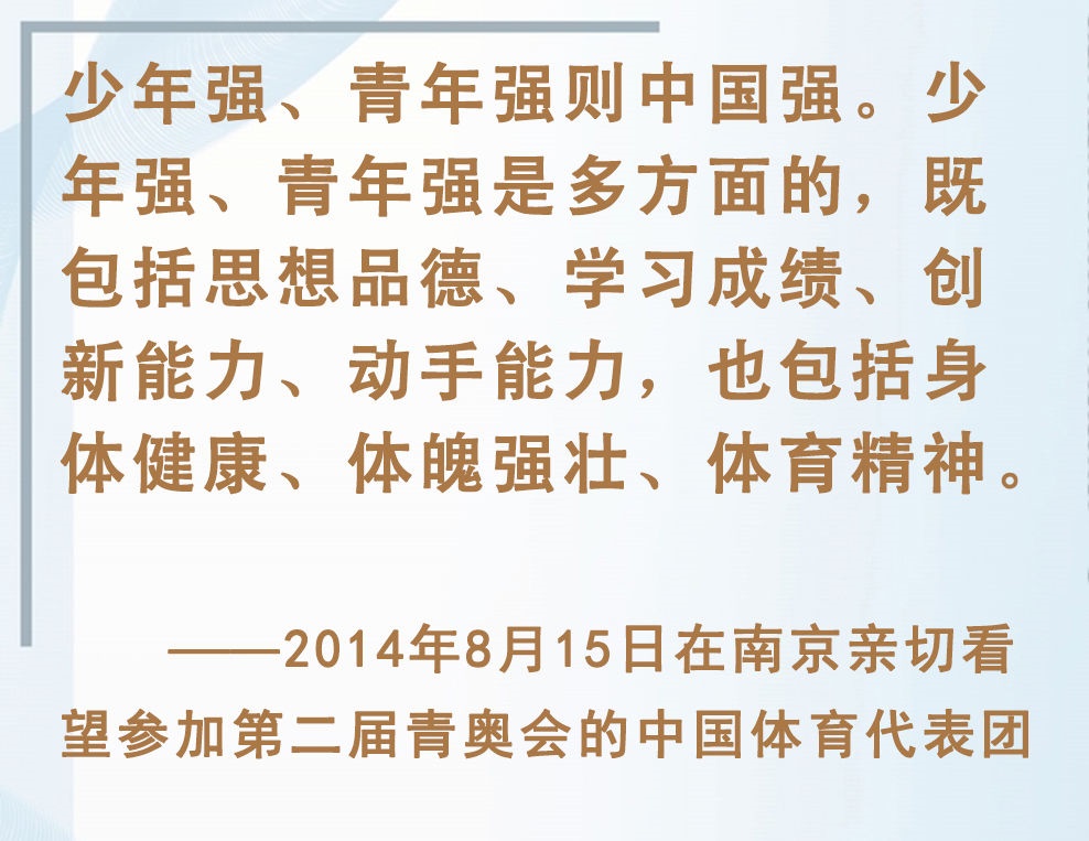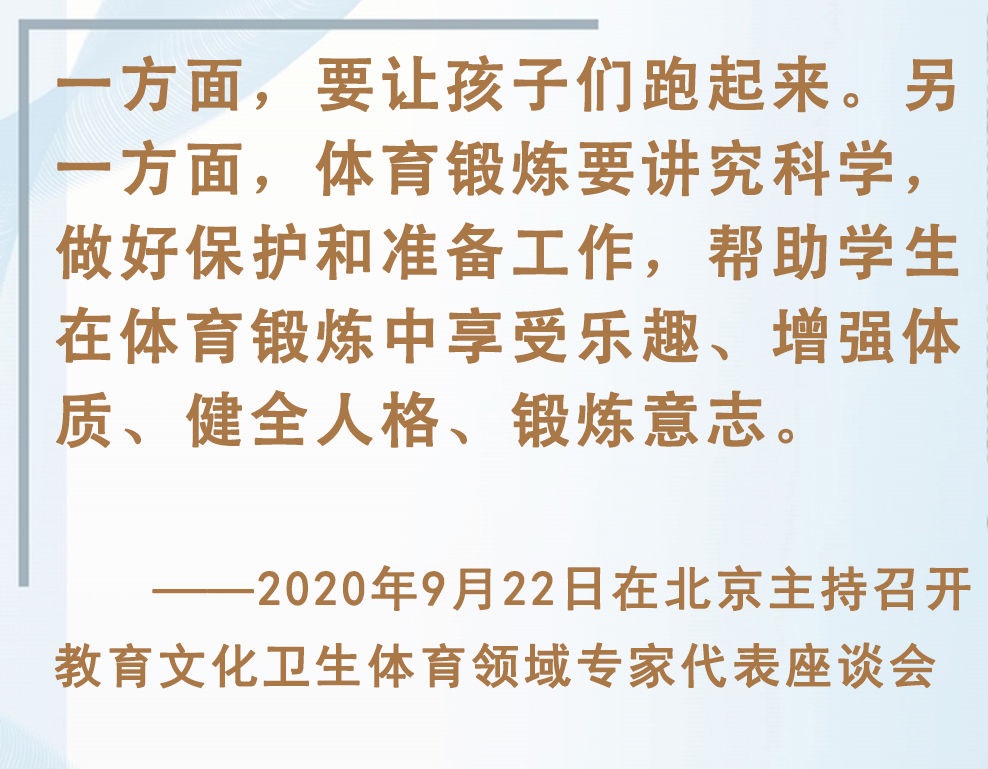 青少年是祖國的未來、民族的希望。強(qiáng)健的體魄是青少年成長(zhǎng)成才的重要前提。對(duì)加強(qiáng)體育教育,增強(qiáng)青少年體質(zhì),習(xí)近平總書記念茲在茲。