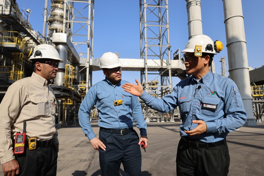 2022年11月27日,在沙特西部城市延布,中沙延布煉廠的員工在交流。總投資86億美元的中沙延布煉廠是中國石化與沙特阿拉伯石油公司合資興建的項(xiàng)目,自2016年1月20日由兩國元首共同啟動(dòng)投產(chǎn)以來,發(fā)展迅速。今年1月至8月累計(jì)實(shí)現(xiàn)利潤(rùn)11.5億美元。