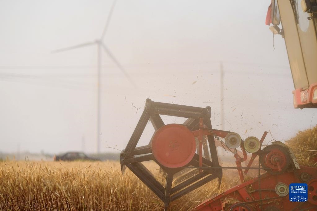 在河南省安陽(yáng)市湯陰縣菜園鎮(zhèn)高標(biāo)準(zhǔn)農(nóng)田示范區(qū),收割機(jī)在麥田作業(yè)(2022年6月8日攝)。新華社記者 郝源 攝