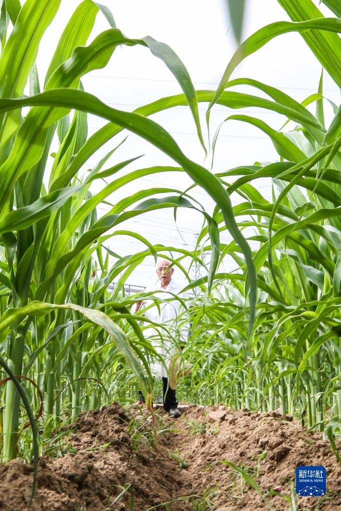 玉米育種專家程相文在海南三亞南繁科研育種基地觀察玉米生長(zhǎng)情況(2022年12月15日攝)。新華社記者 張麗蕓 攝