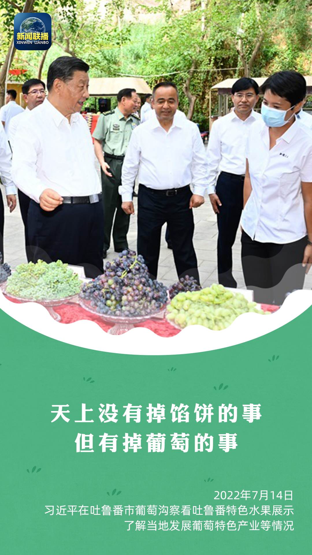 “多么富饒的一個地方,瓜果飄香。這是大自然的饋贈?!笨倳涳L(fēng)趣地說,“天上沒有掉餡餅的事,但有掉葡萄的事?!笨倳涍€強(qiáng)調(diào),要推動文化和旅游融合發(fā)展,打造富民產(chǎn)業(yè)。