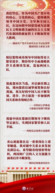 多國(guó)領(lǐng)導(dǎo)人在賀電賀函中表達(dá)他們對(duì)習(xí)近平全票當(dāng)選的祝賀與敬佩之情。