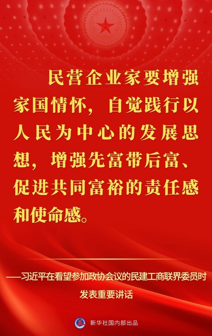 “黨中央始終堅持‘兩個毫不動搖’、‘三個沒有變’,始終把民營企業(yè)和民營企業(yè)家當(dāng)作自己人?!?月6日,習(xí)近平總書記在看望參加全國政協(xié)十四屆一次會議的民建、工商聯(lián)界委員并參加聯(lián)組會時發(fā)表重要講話,強調(diào)要引導(dǎo)民營企業(yè)和民營企業(yè)家正確理解黨中央方針政策,增強信心、輕裝上陣、大膽發(fā)展。