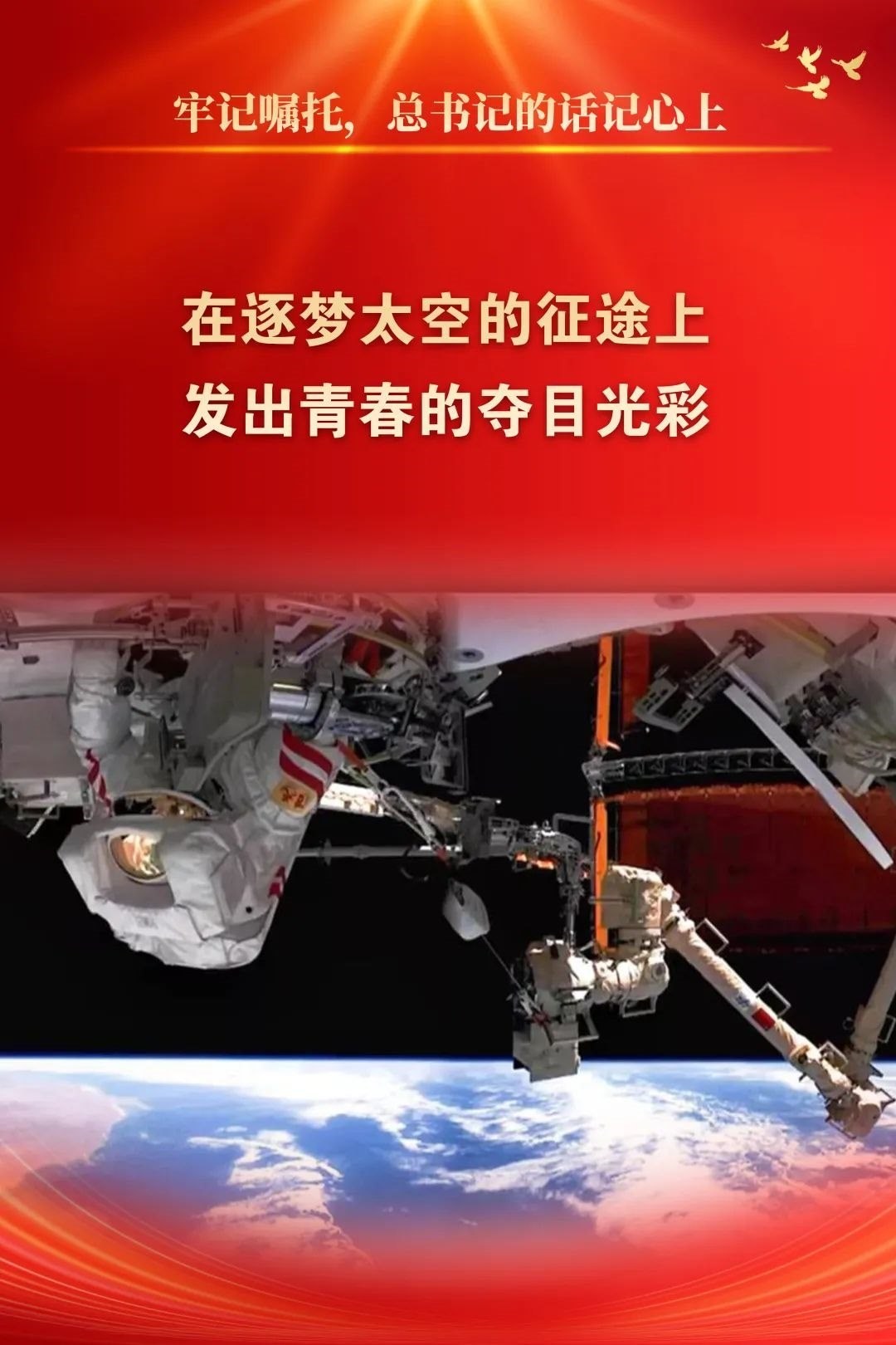 2013年5月4日,習近平總書記到航天科技集團五院參加“實現(xiàn)中國夢、青春勇?lián)敗敝黝}團日活動時指出:“我們同青年朋友們到航天城來,就是要實地感受載人航天精神,激勵包括廣大青年在內(nèi)的全國各族人民為實現(xiàn)中華民族偉大復興的中國夢而奮斗?!笔陙恚逶喝耸冀K堅定沿著黨指引的方向前進,圓滿完成了以載人航天、探月探火、北斗導航等為代表的一系列航天重大工程任務。