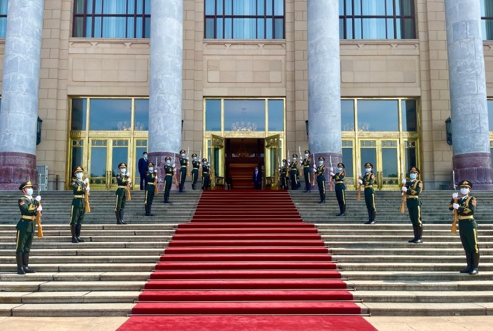 伊薩亞斯抵達時,禮兵列隊致敬。兩國元首登上檢閱臺,軍樂團奏中厄兩國國歌,天安門廣場鳴放21響禮炮。伊薩亞斯在習(xí)近平陪同下檢閱中國人民解放軍儀仗隊,并觀看分列式。