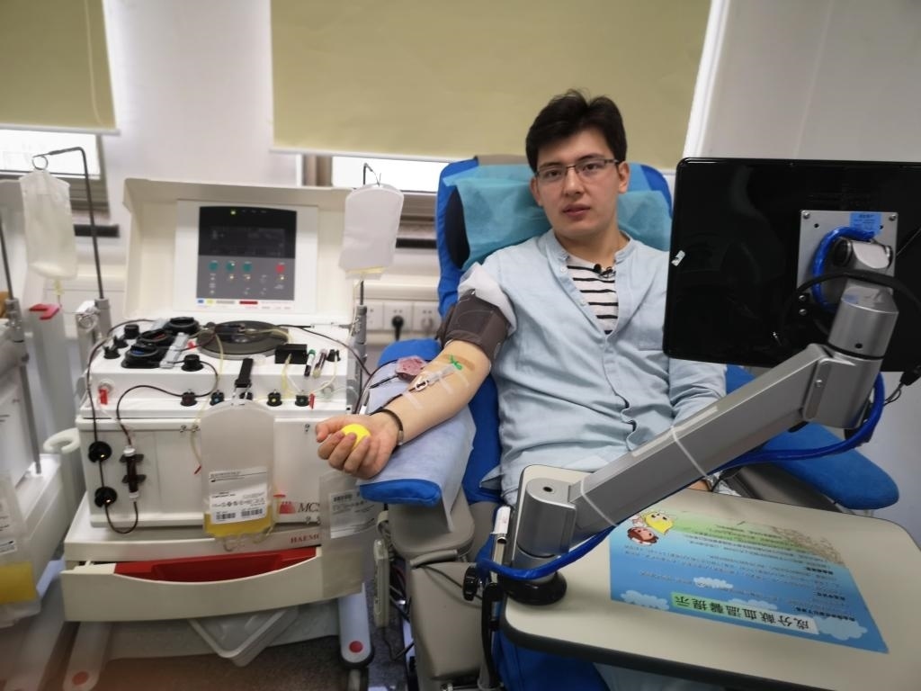 魯斯蘭在北京市紅十字血液研究所獻血(2018年5月22日攝)。新華社發(fā)