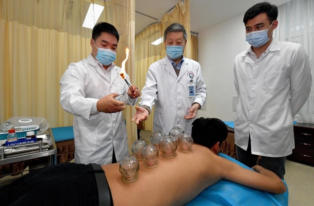 2020年11月10日,陜西中醫(yī)藥大學針灸推拿學院教授賈成文(中)在指導馬文軒(右)進行拔罐。新華社記者 劉瀟 攝
